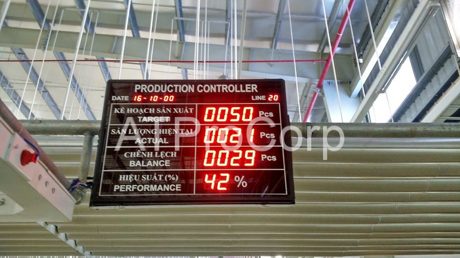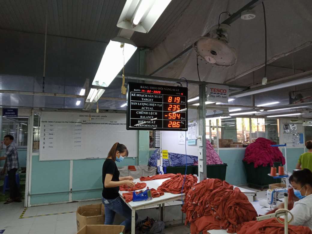 Các thông số sản xuất hiển thị đồng thời trên bảng led tại các chuyền sản xuất và phần mềm giám sát.