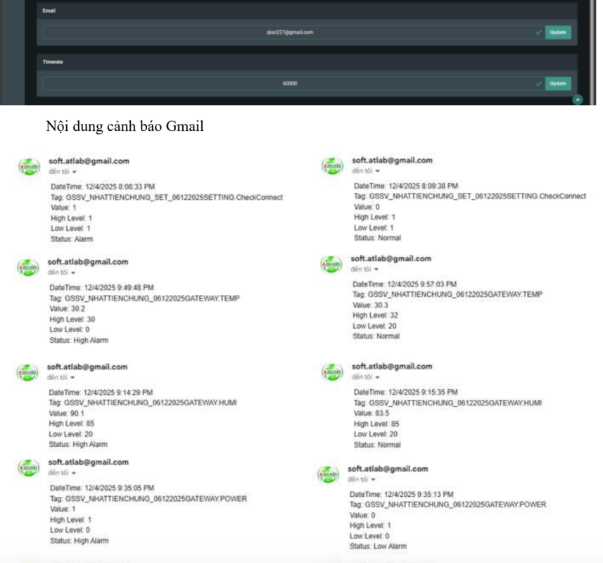 Khi phát hiện các chỉ số vượt ngưỡng cho phép, hệ thống sẽ gửi cảnh báo qua màn hình, email hoặc tin nhắn. Điều này giúp đội ngũ kỹ thuật phản ứng nhanh, hạn chế nguy cơ hư hỏng thiết bị và gián đoạn hệ thống.