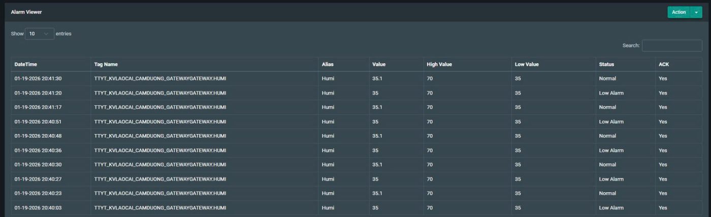 - Alarmviewer: hiển thị các cảnh báo sự cố gần đây nhất. Các cảnh báo mới nhất sẽ hiện màu đỏ. Đối với các cảnh báo cũ mà người vận hành đã biết hoặc đã xử lý nhấp mũi tên :ACTION = > Acknowledge dòng cảnh báo đỏ sẽ chuyển sang xanh.